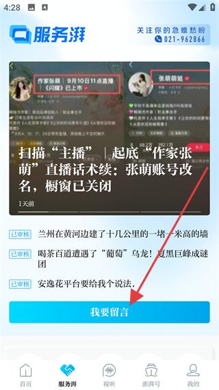 1、進入服務湃頁面,在頁面中找到我要留言按鈕,點擊該按鈕,可進入留言相關界面,進行留言操作。