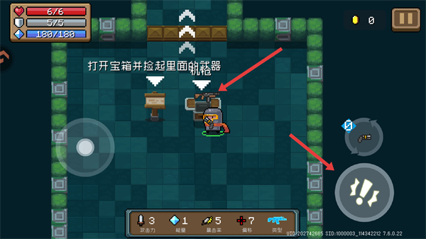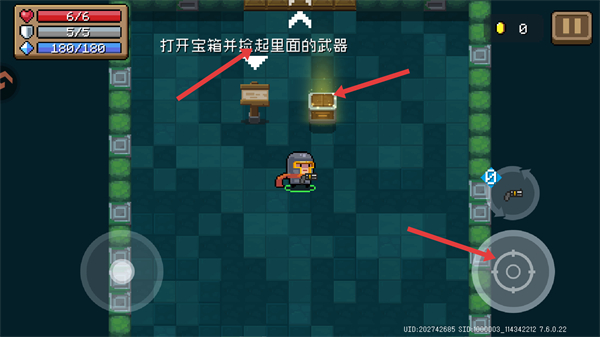 1、進入游戲場景,看到寶箱,靠近后打開它,能撿起里面的武器,獲取新的戰斗裝備。