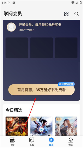 4、登錄后進入會員頁面,查看開通會員的優惠信息,同時可瀏覽今日精選的小說內容,選擇感興趣的書籍閱讀。