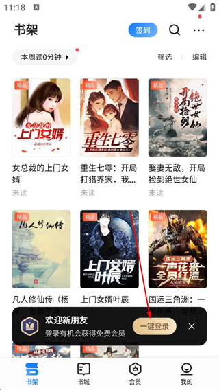 2、進入書架頁面,查看推薦的未讀小說,可點擊小說開始閱讀,同時可使用簽到、篩選等功能管理書架內容。