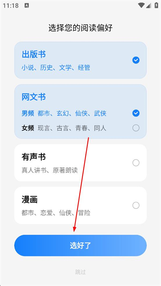 1、打開掌閱軟件,進入閱讀偏好選擇頁面,勾選出版書、網文男頻等偏好分類,點擊選好了完成偏好設置。