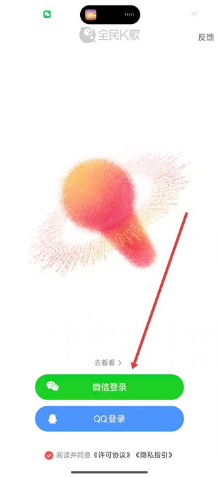 1、打開全民K歌,勾選閱讀并同意相關協議,選擇微信登錄方式,完成賬號登錄,進入軟件主界面。