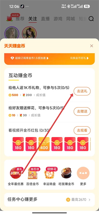 2、進入天天賺金幣頁面查看互動賺金幣任務,點擊去送禮按鈕,參與給他人送K幣禮物的任務,獲取對應的金幣及成長值獎勵。