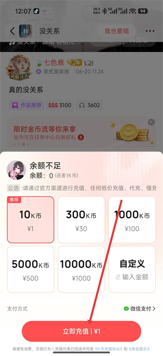 4、K幣余額不足進入充值頁面,選擇想要充值的K幣金額,確認支付方式后點擊立即充值,完成充值以便繼續贈送禮物。