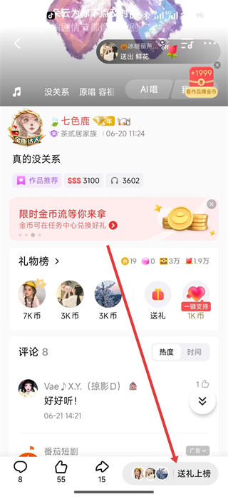 3、在歌曲作品詳情頁查看他人演唱的作品,點擊送禮上榜按鈕,選擇想要贈送的禮物,參與互動提升作品熱度。