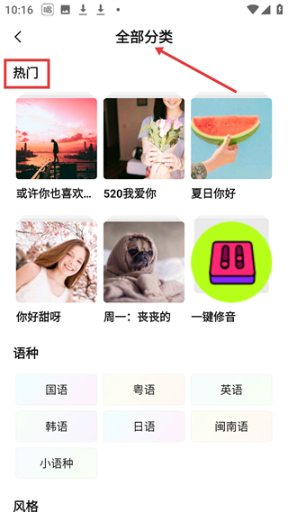 3、全部分類頁面,有熱門主題分類,如或許你也喜歡等,還涵蓋國語、粵語等多語種及不同風格分類方便選歌。