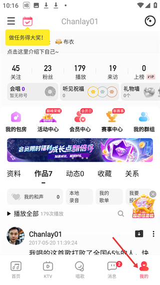 4、我的頁面顯示用戶關注、粉絲等數據,有我的包房、活動中心等功能入口,還展示用戶作品及相關播放數據。