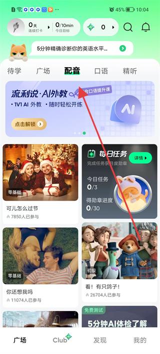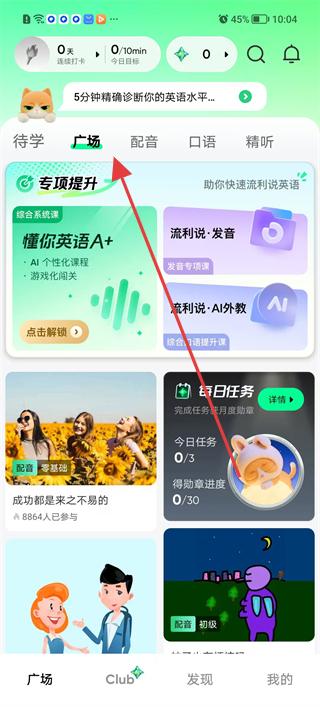 2、進入廣場頁面瀏覽專項提升板塊的懂你英語A、流利說發音等課程,查看每日任務與不同主題的學習內容,挑選感興趣的板塊,規劃英語學習方向。