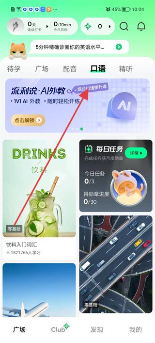 4、進入口語板塊查看流利說AI外教等口語提升內容,參與飲料入門詞匯等口語學習,提升英語口語表達能力,同時完成每日任務,積累學習進度,全面提升英語水平。