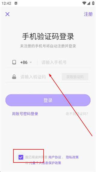 1、打開用藥助手軟件,進入手機驗證碼登錄頁面,輸入手機號獲取并填寫驗證碼,勾選相關協議后點擊登錄按鈕。