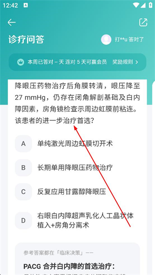 3、在診療問答詳情頁查看題目描述及選項內容,分析該患者的進一步治療選擇,了解不同治療方案的適用情況。