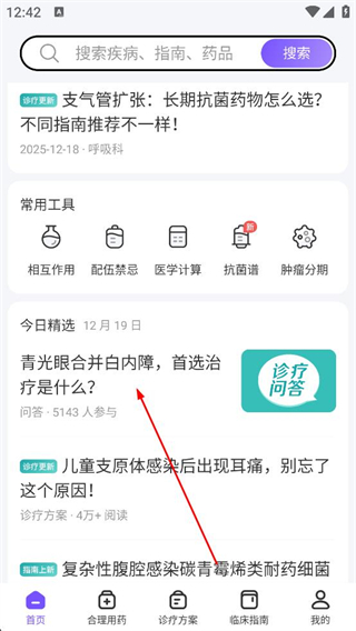 2、登錄后進入首頁瀏覽今日精選板塊的診療內容,選擇青光眼合并白內障首選治療是什么的問答,點擊進入詳情頁。