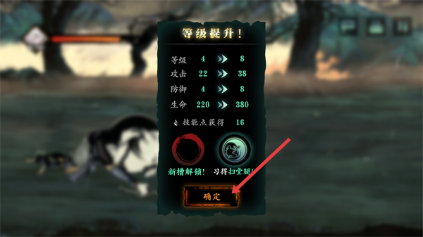 2、升級后攻擊、防御、生命等屬性提升,還能獲得技能點,解鎖新技能,點擊確定按鈕繼續游戲。
