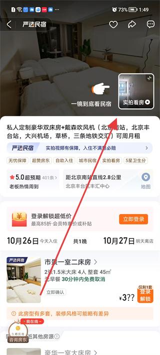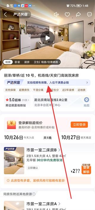 2、在房源列表頁面選擇感興趣的民宿,如麗澤草橋近10號的高端雙床房,點擊進入該民宿詳情頁面。