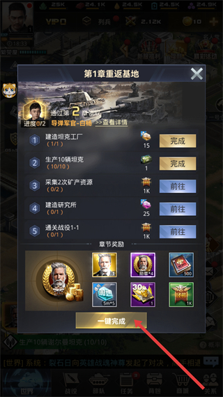 1、可完成章節任務,如生產坦克、采集資源等,點擊一鍵完成領取獎勵,推進游戲進程。