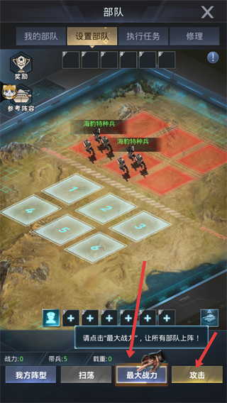 3、可設置部隊,點擊最大戰力讓所有部隊上陣,然后點擊攻擊,與敵方展開戰斗,提升戰斗策略性。
