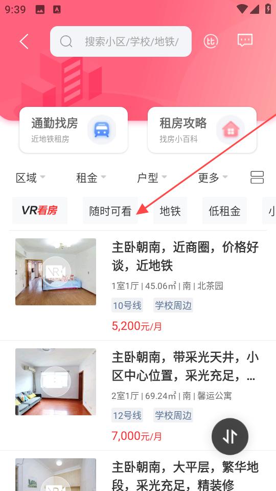 2、租房界面,有通勤找房、租房攻略等功能入口,還有VR看房、隨時可看等篩選條件,展示了多個租房房源信息。