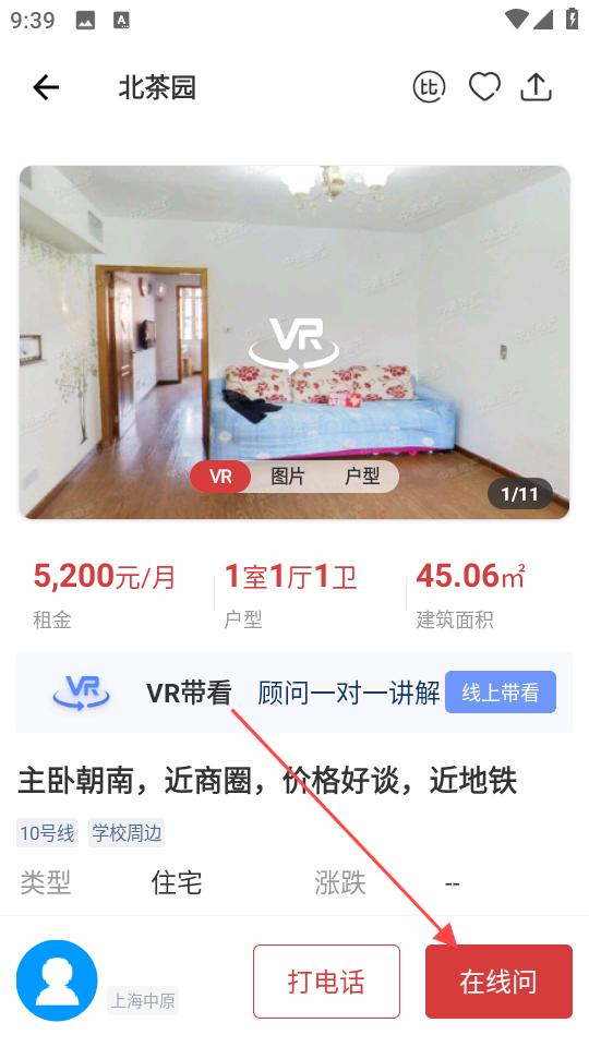 3、房源詳情界面,展示了北茶園的一套租房房源信息,包括租金、戶型等,還有VR帶看功能,用戶可選擇打電話或在線問與顧問溝通。