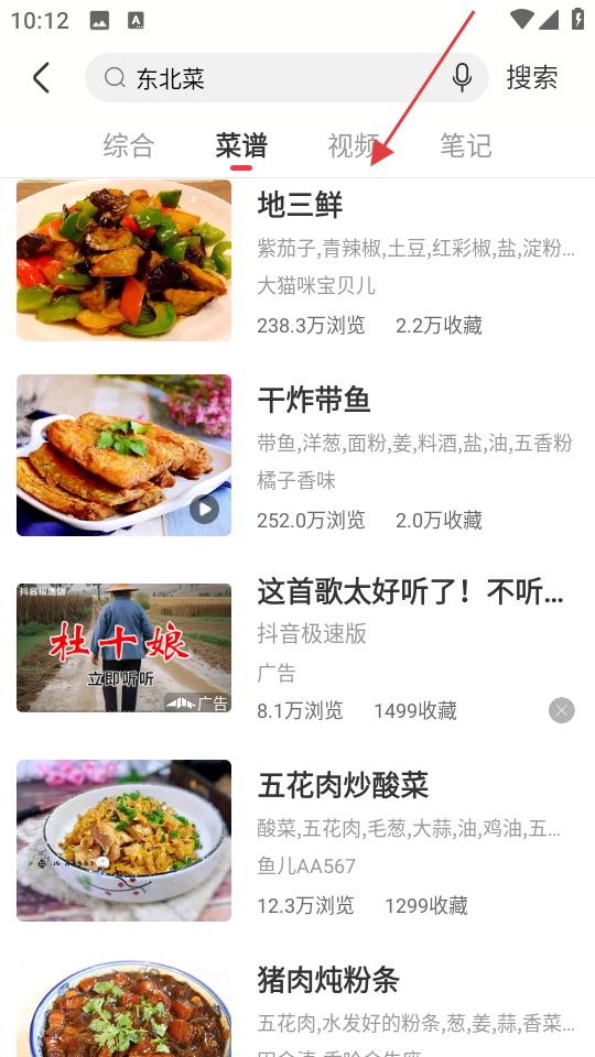 1、菜譜展示頁面,其中地三鮮菜譜較為受歡迎,有較高的瀏覽量和收藏量,此外還有干炸帶魚、五花肉炒酸菜等其他東北菜菜譜可供查看。