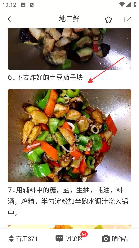 3、菜譜的制作步驟,第6步是放入炸好的土豆茄子塊,第7步則是用糖、鹽等多種調料調汁澆入鍋中。