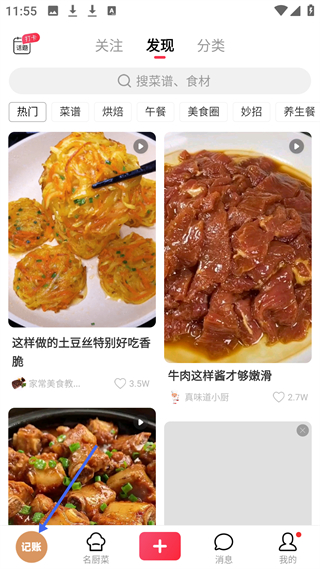 1、美食APP發現頁面,可搜菜譜、食材,有熱門、菜譜等分類標簽,展示香脆土豆絲、嫩滑醬牛肉等美食內容,獲高點贊。