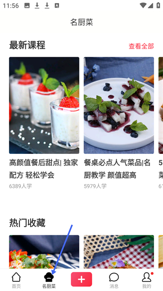 2、名廚菜頁面設最新課程與熱門收藏板塊,最新課程有高顏值餐后甜點等,熱門收藏也展示多樣美食助力學習廚藝。