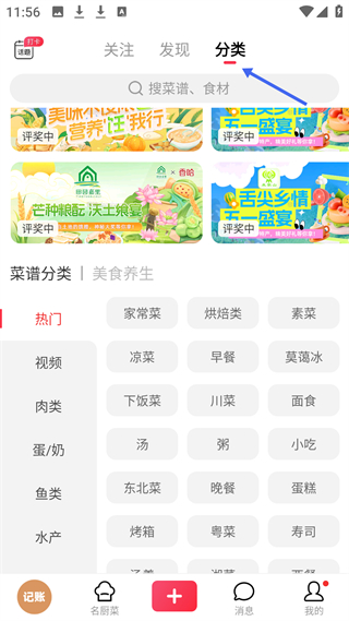 3、分類頁面能搜菜譜、食材,有美食養生等主題活動,菜譜分類豐富,含熱門、家常菜、烘焙類等,方便查找不同菜品。