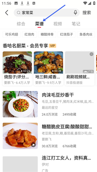 4、搜索家常菜后進入菜譜頁面,有可樂雞翅等標簽,展示香哈名廚菜及肉沫毛豆炒香干等家常菜,瀏覽收藏量高。