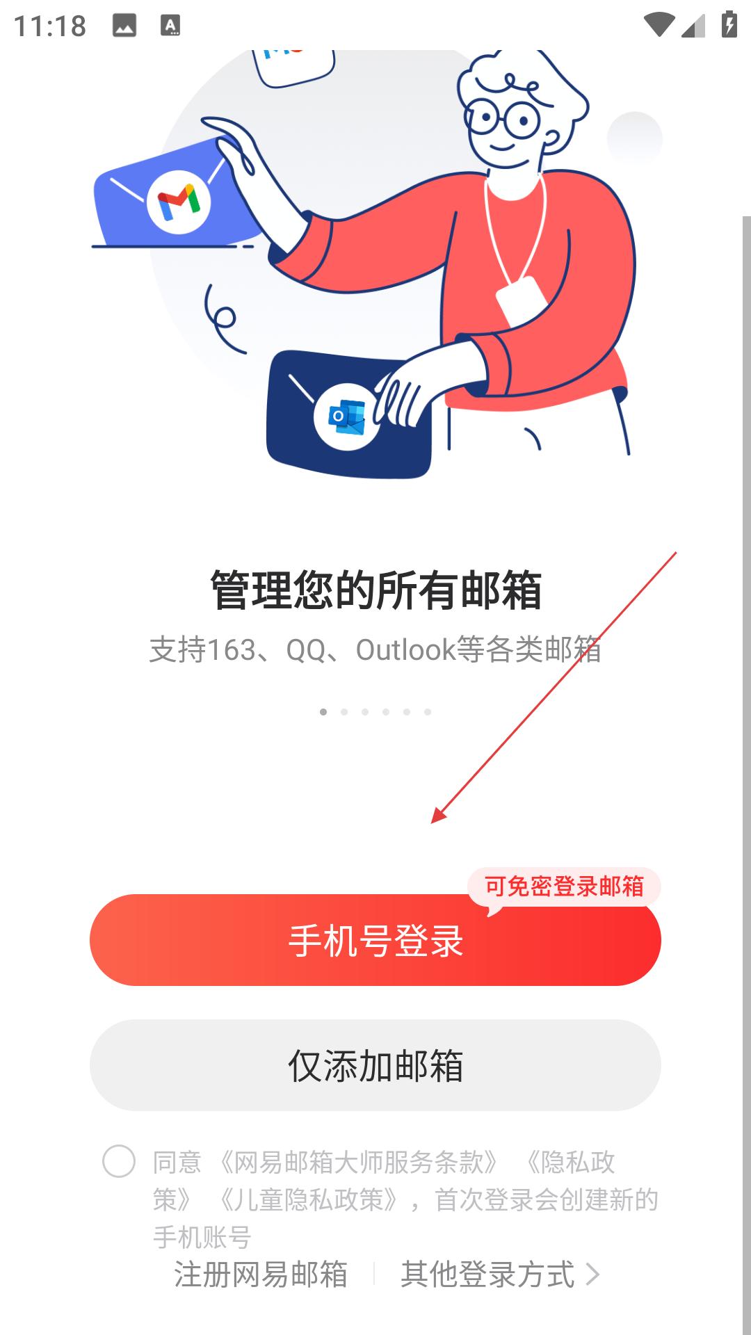 1、登錄界面,用戶可選擇手機號登錄或僅添加郵箱,支持多種郵箱類型,登錄前需勾選同意相關條款。