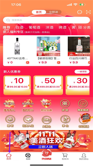 1、首頁有搜索功能和多酒類入口,展示新人福利、優惠券和各類活動板塊,全方位助力用戶搜索和選購酒類商品。