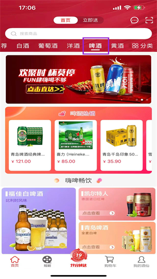 2、啤酒頁有搜索功能和多款啤酒展示,涵蓋青島、喜力等品牌,方便用戶查看和選購啤酒。