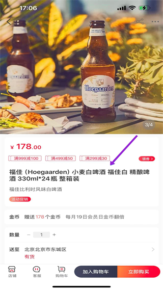 3、商品詳情頁展示福佳白啤酒的圖片、價格和詳情,有加入購物車和立即購買功能,助力用戶深入了解商品并進行選購。