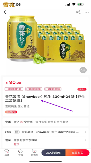 4、商品詳情頁展示雪花純生啤酒的圖片、價格和詳情,有加入購物車和立即購買功能,方便用戶了解商品并進行選購。