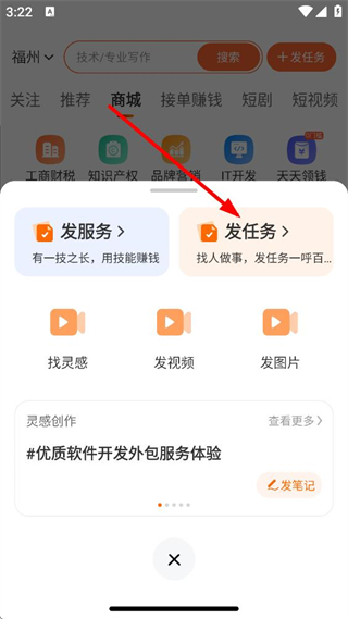 2、可選擇發服務或發任務,發服務可憑借技能賺錢,發任務可找人做事,還可找靈感、發視頻圖片,豐富用戶服務和任務發布體驗。