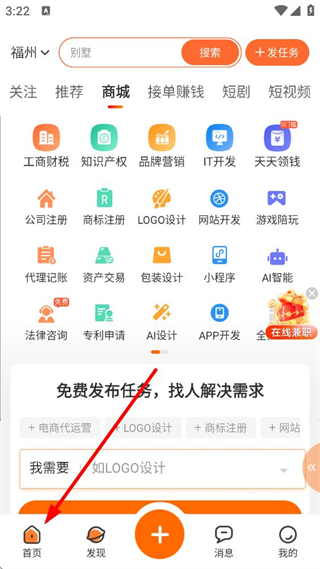 1、進入首頁,可選擇福州地區,搜索服務類型,使用工商財稅、知識產權等服務入口,還可免費發布任務,找人解決需求,方便用戶獲取各類服務和發布任務。