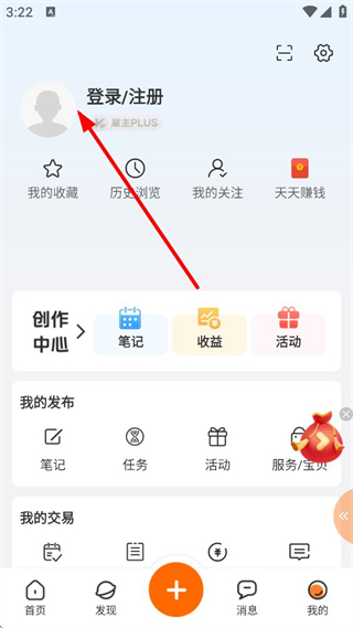 3、點擊我的,可進行登錄注冊,管理我的收藏、歷史瀏覽、我的關注,參與天天賺錢活動,使用創作中心的筆記、收益、活動功能,發布筆記、任務等。