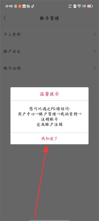 4、閱讀溫馨提示后點擊我知道了,可根據提示在PC端進行賬號注銷操作,完成賬號的注銷流程。