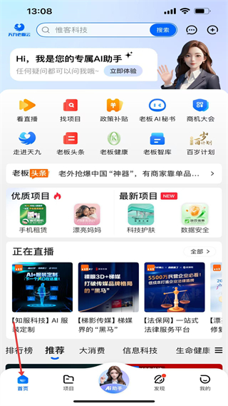 1、首頁板塊,名為天九老板云,有看直播等功能入口,展示優質項目與直播內容,支持搜索功能,呈現企業服務內容。