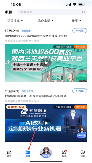 2、項目板塊,可按行業金額篩選,展示紐西之謎等項目,標注總部與合作金額,支持預約直播,方便用戶查找企業項目。
