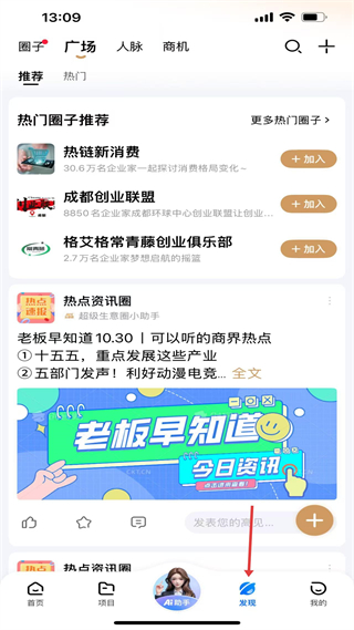 3、發現板塊,有熱門圈子與熱點資訊,展示熱鏈新消費等圈子,呈現商界資訊,方便用戶拓展人脈與獲取資訊。