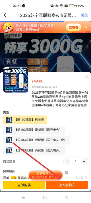 3、商城中點擊商品,進入2025蘇寧互聯隨身wifi商品詳情頁,可查看商品介紹、套餐價格等信息,還有圖文詳情等板塊。