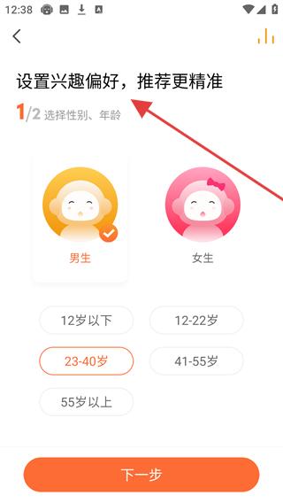 3、選擇性別和年齡,根據自身情況選擇后點擊下一步進入興趣設置的第二步。