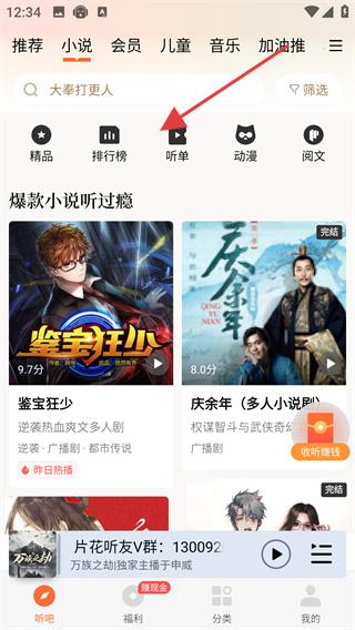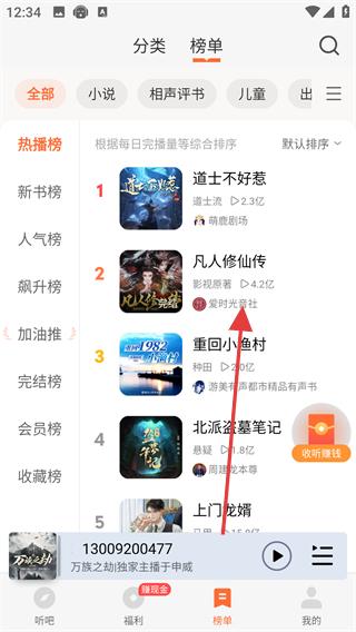 2、在聽吧頁面找到榜單分類點擊進入榜單頁面,在榜單中找到自己喜歡的書籍,點擊進入該作品播放頁面。