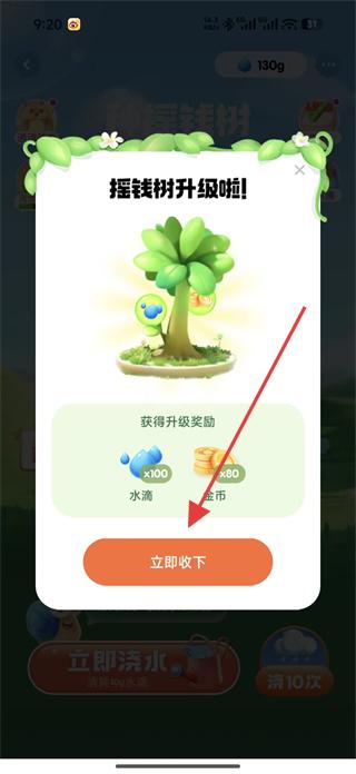 2、搖錢樹升級后彈出搖錢樹升級啦的提示框,點擊立即收下,領取升級獎勵的水滴和金幣。
