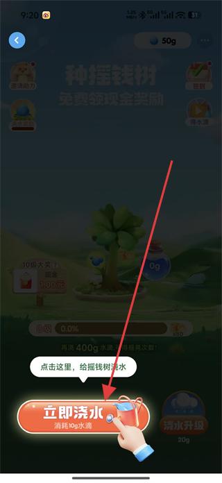 1、進入軟件種搖錢樹頁面,看到點擊這里給搖錢樹澆水的提示,點擊立即澆水,消耗水滴給搖錢樹澆水。