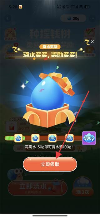 4、在澆水獎勵頁面看到澆水多多獎勵多多的提示,點擊立即領取,獲取水滴獎勵,繼續參與種搖錢樹活動。