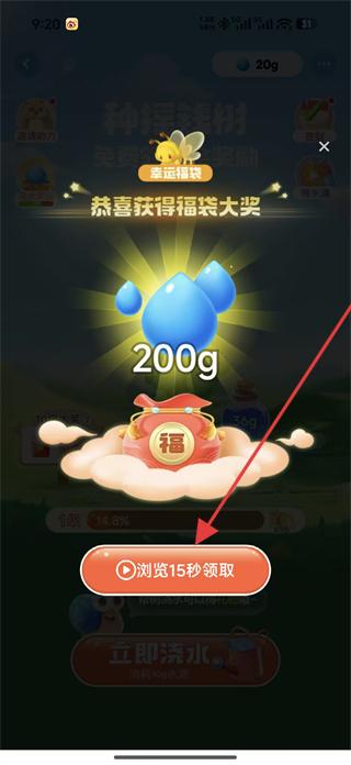 3、獲得福袋大獎后點擊瀏覽15秒領取,通過瀏覽視頻獲取200g水滴獎勵。