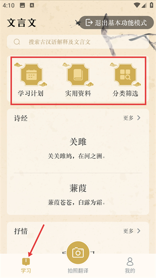 1、學習首頁提供學習計劃等功能入口,展示詩經等經典篇目,支持搜索古漢語解釋,助力文言文學習規劃。