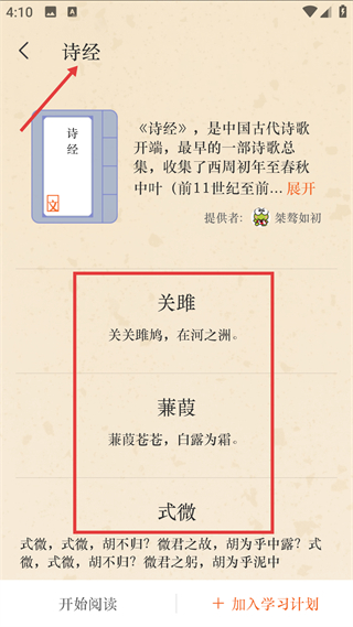 2、詩經板塊呈現詩經介紹,羅列多篇目,支持閱讀與加入學習計劃,方便系統學習這一經典文學作品。