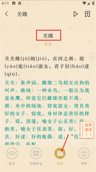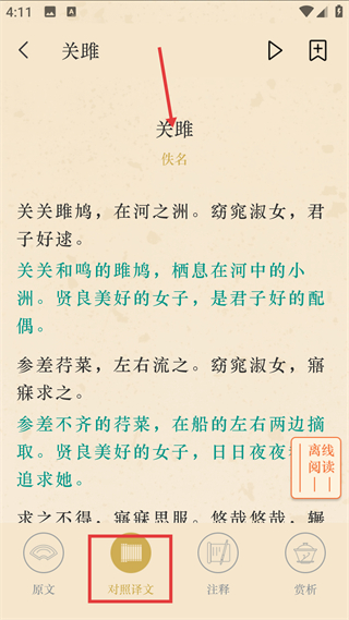 3、篇目閱讀頁展示關雎原文與對照譯文,提供離線閱讀,支持切換不同模式,輔助理解文本內容。